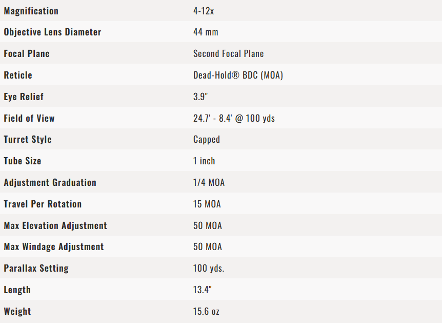 Dead-Hold® BDC (MOA) - Customized hashmark design helps eliminate guesswork on holdover and windage corrections. Good for hunting/shooting at varying ranges where estimating holdover is a concern